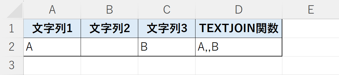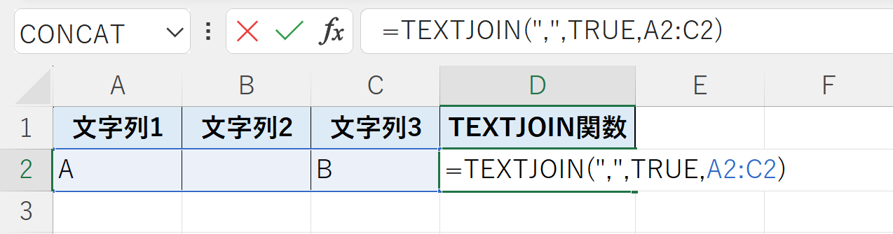 TRUEの場合は、空のセルを無視して区切り文字を挿入されていません。